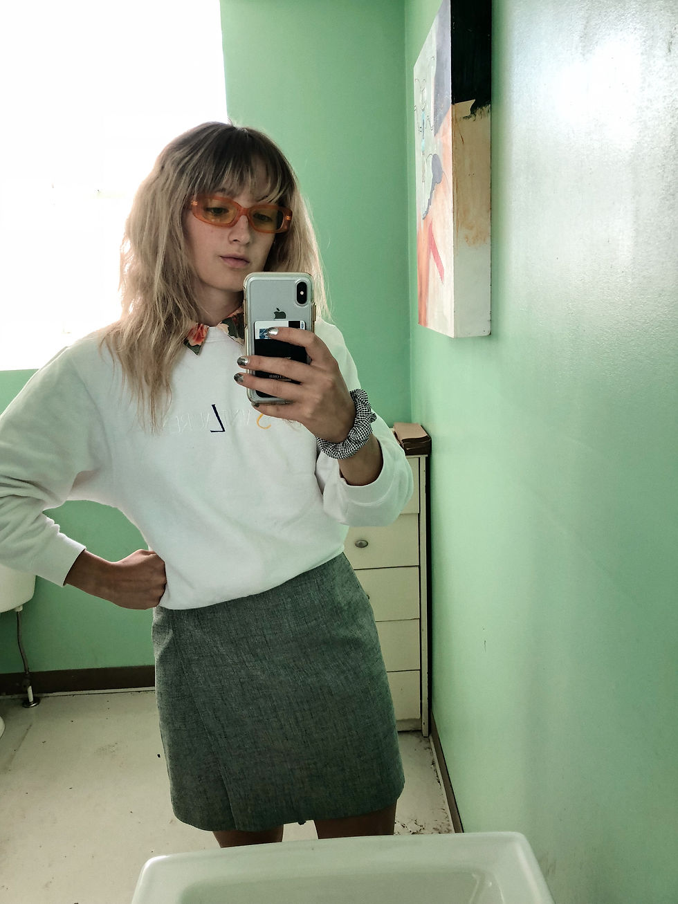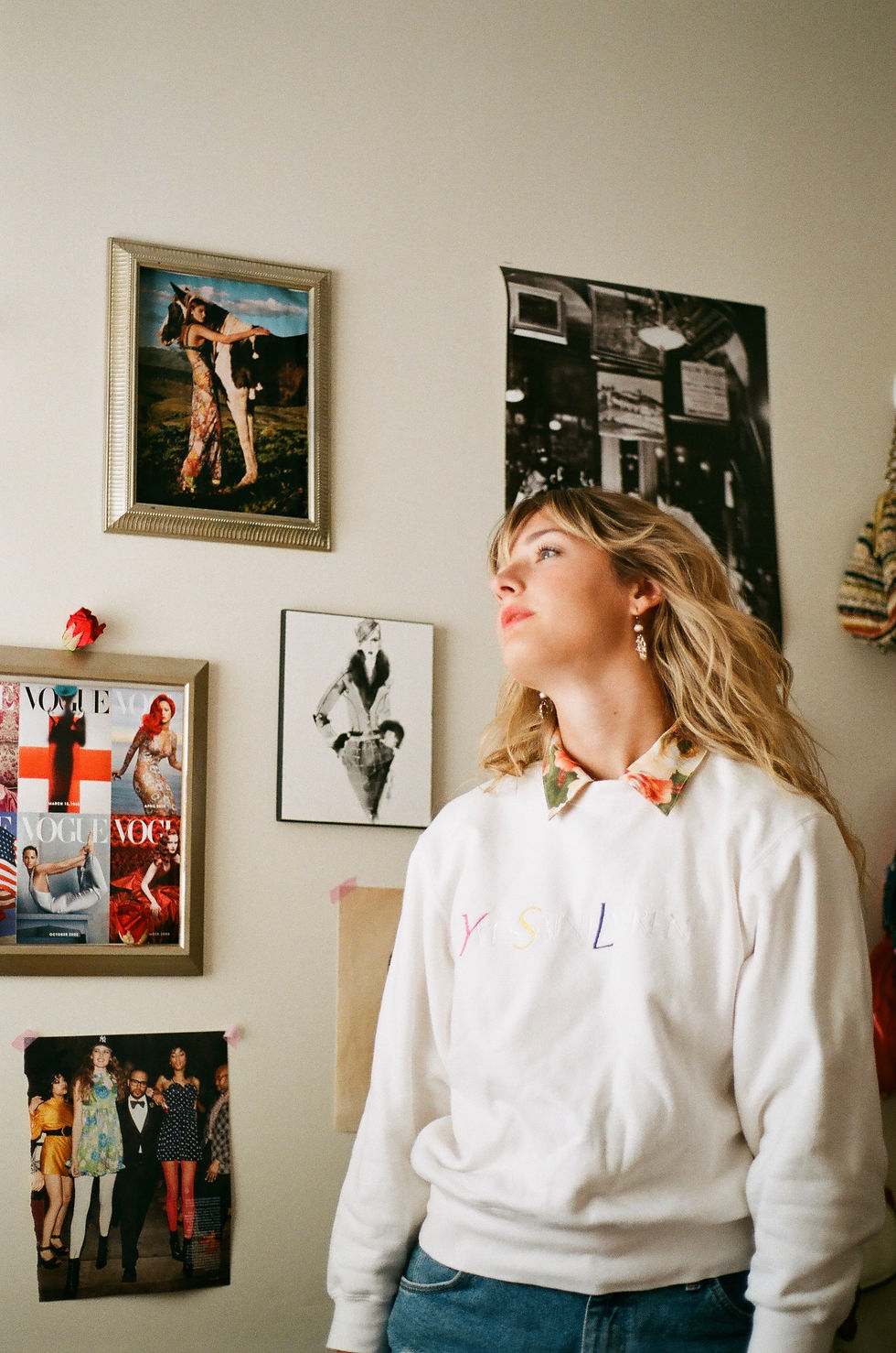 My turn! Kaity actually bought this sweatshirt from Treasures of NYC, and I "borrowed" it. I wore it two times, both with the same button up underneath because I loved the color of the collar. To make this sweatshirt more interesting, I like the styling trick of layering a collared shirt or turtleneck underneath. This look is captured quite artfully in a coffee shop bathroom selfie and in film photography shot in my room.